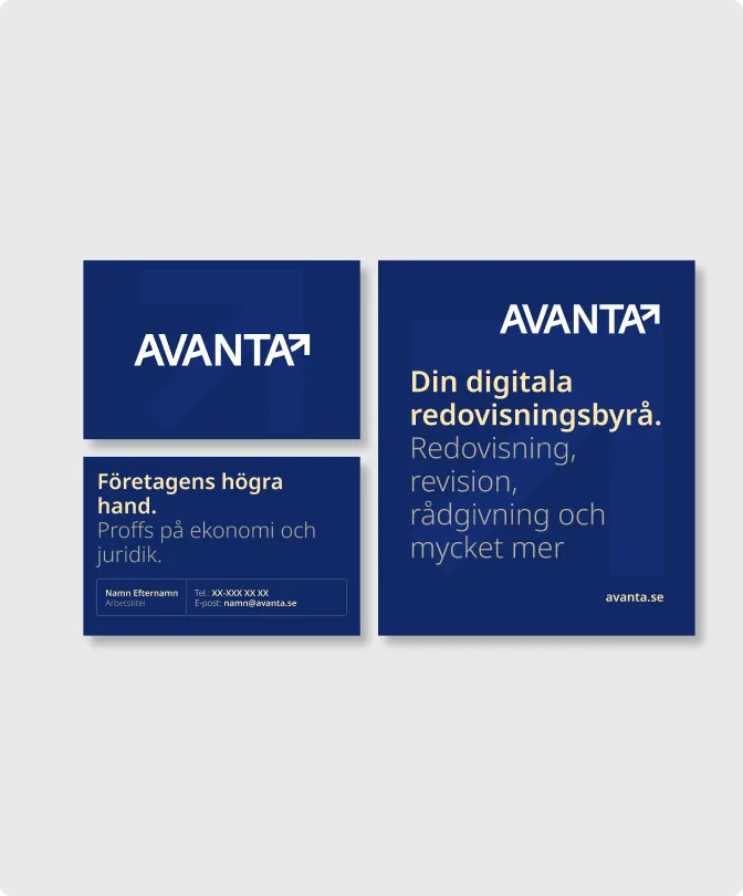 Den grafiska profilen bygger på en elegant balans mellan det moderna och det tidlösa. Den djupblå primärfärgen förmedlar förtroende och stabilitet, medan den beige tonen tillför värme och distinktion. Tillsammans skapar de en färgpalett som särskiljer Avanta i en bransch där många kommunicerar med neutrala eller konservativa uttryck. Formspråket är subtilt, rent och genomtänkt – med fokus på innovation och tydlighet.