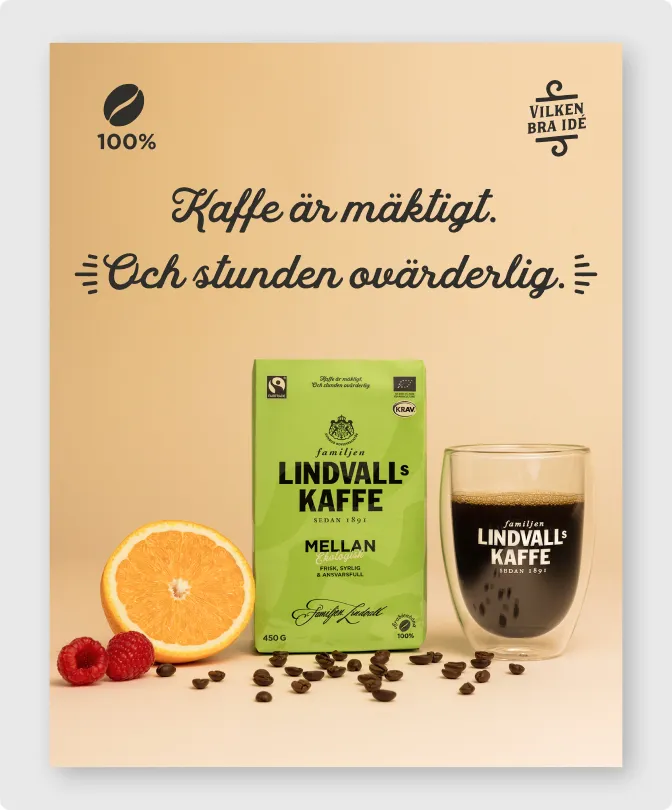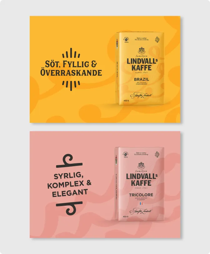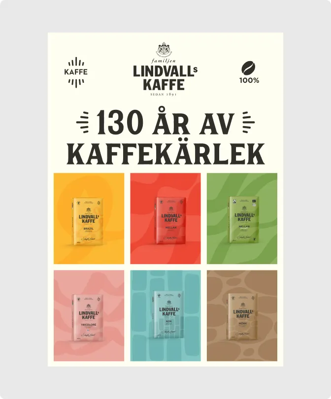 När vi inledde vår dialog med Lindvalls Kaffe var de mitt i processen att förnya designen på sina kaffeförpackningar. Tillsammans insåg vi att timingen var perfekt för en omfattande uppdatering av deras varumärke. En ny grafisk profil med inspiration från förpackningarna togs fram, och med denna som grund skapades nytt bild- och filmmaterial, mallar för sociala medier och hemsida.